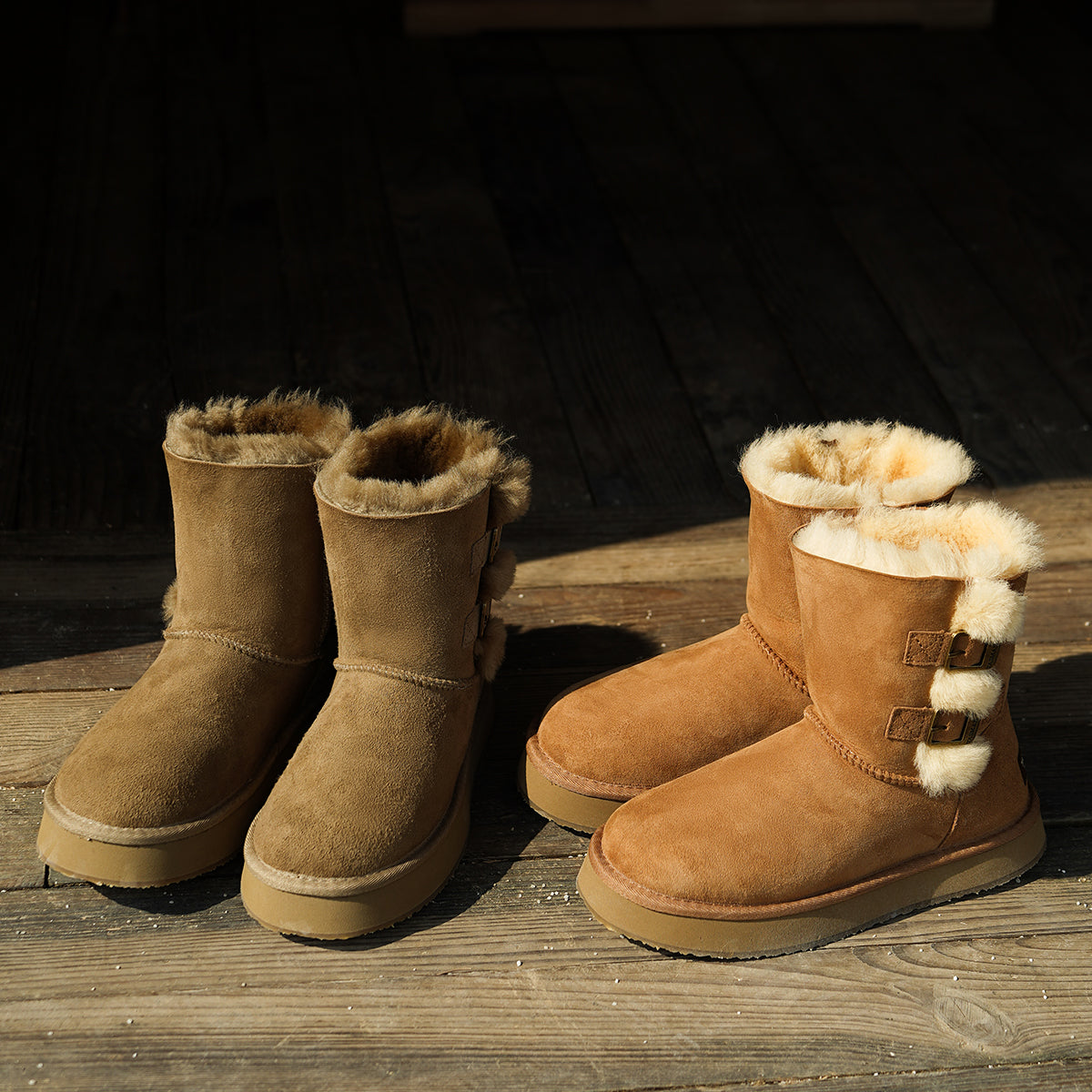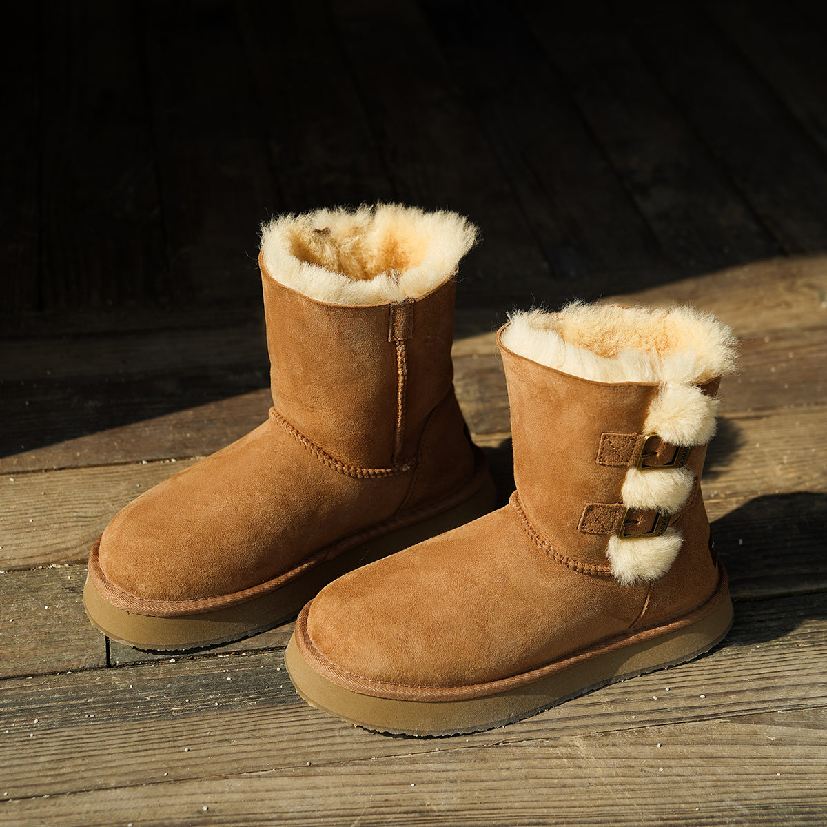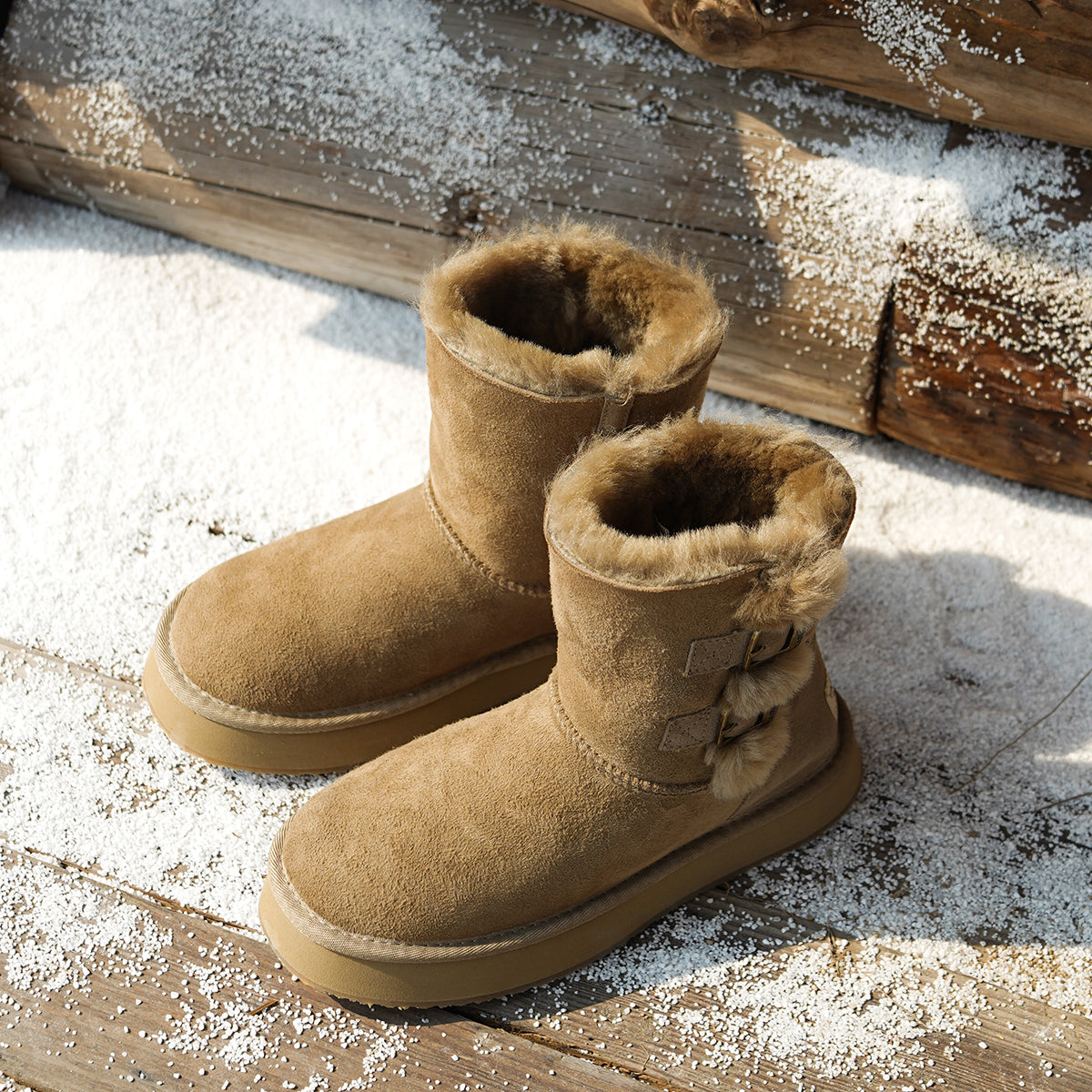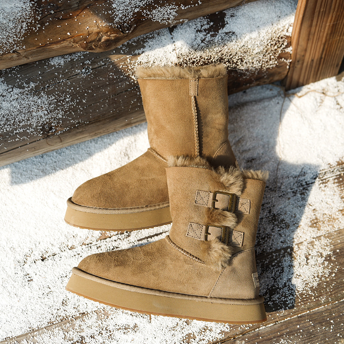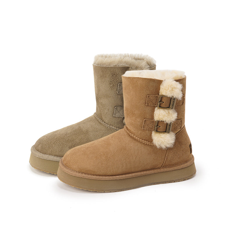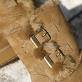 For this winter, look stylish and effortless with the Double-Buckle Knight Snow Boots. This boot offers 2 different looks, a buckled look with two straps or a relaxed, rolled down look. Crafted using Australian Merino sheepskin (combination of fur and leather), they wrap your feet in warmth and maximum comfort. The premium material locks in warmth while removing moisture, thus staying breathable.