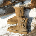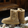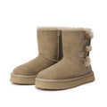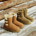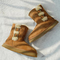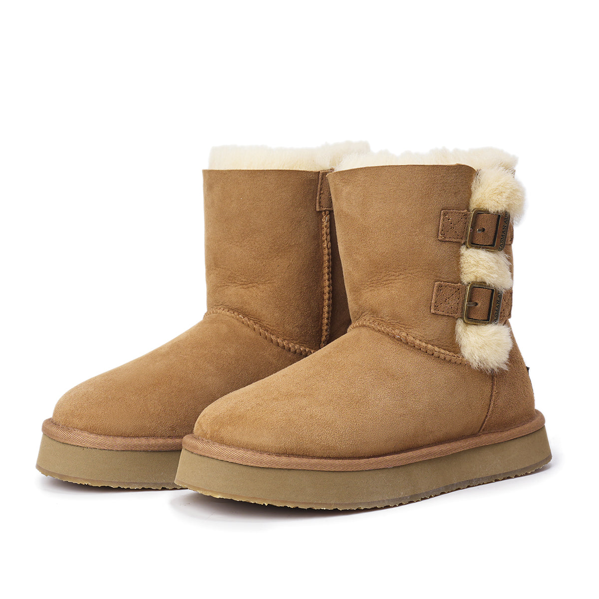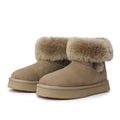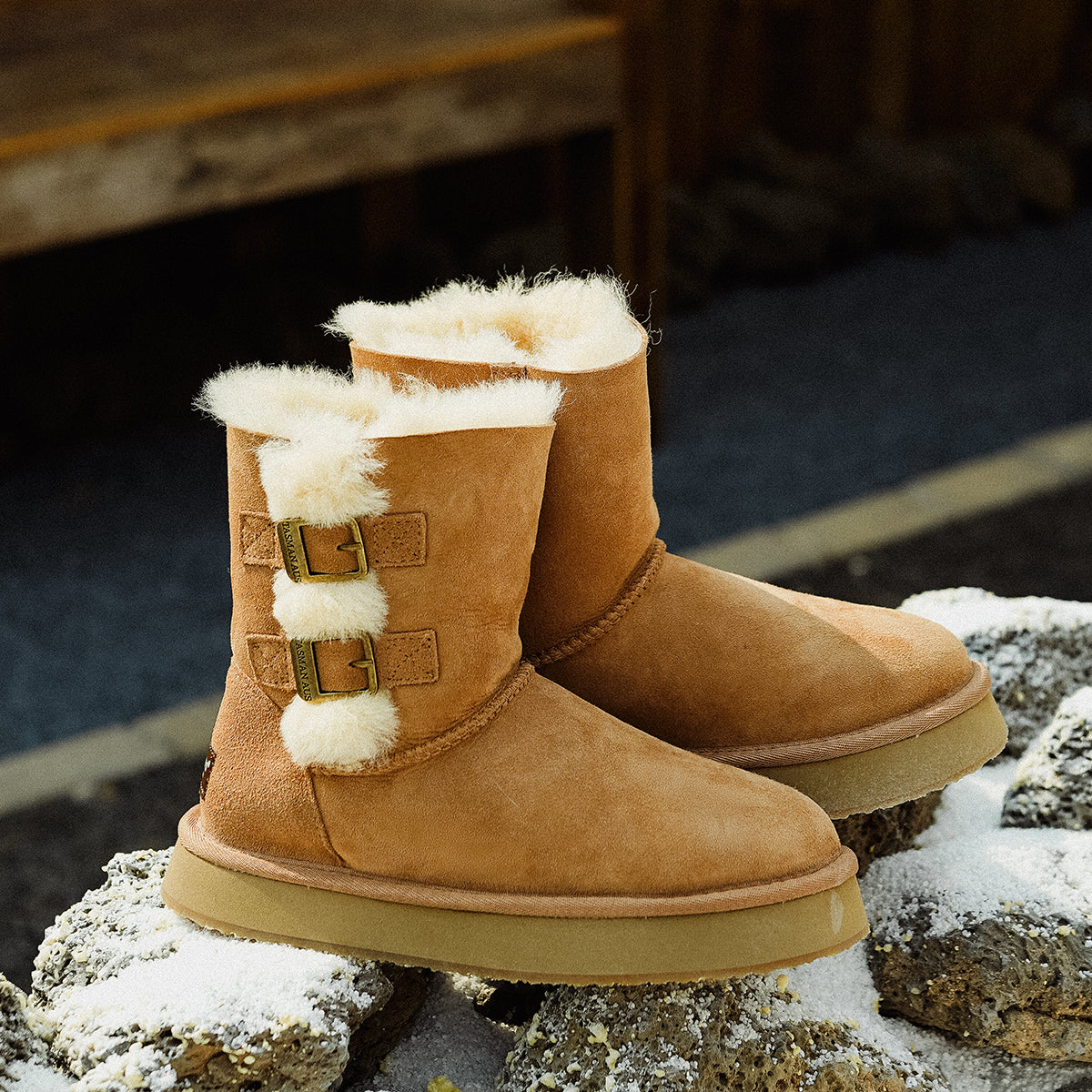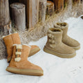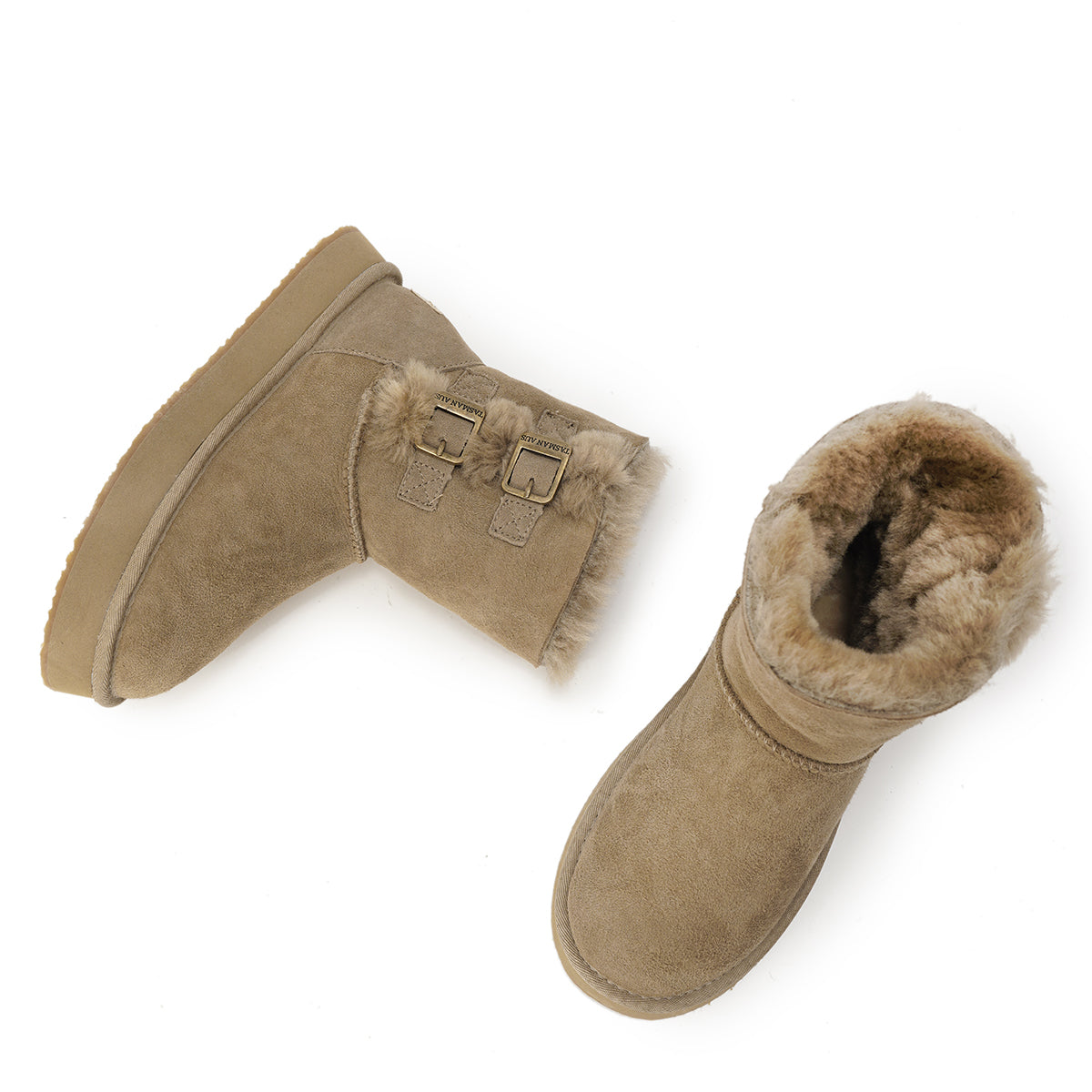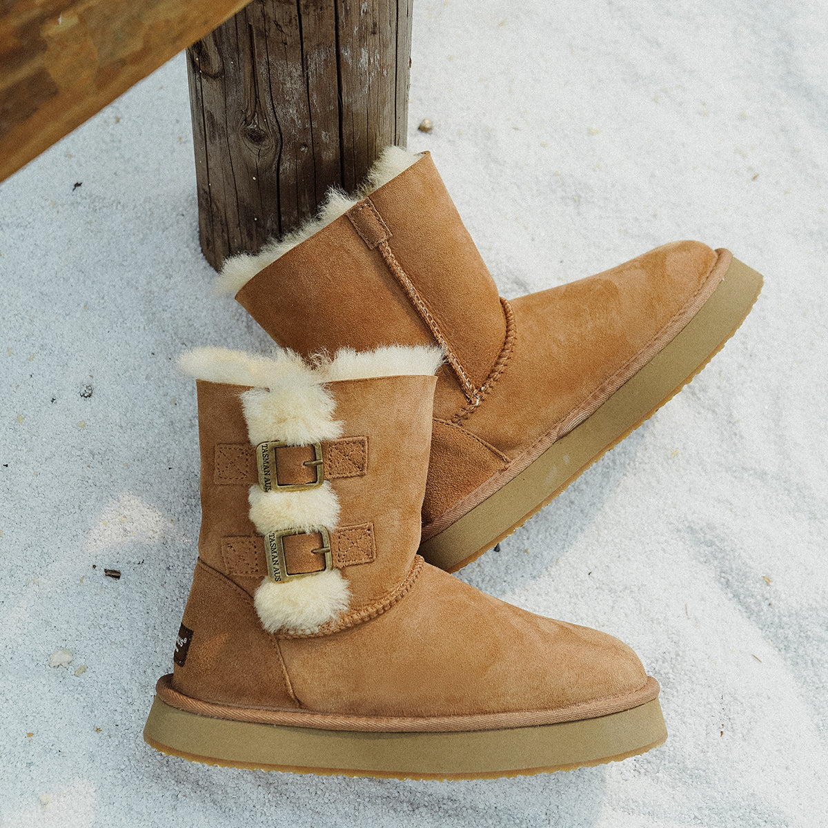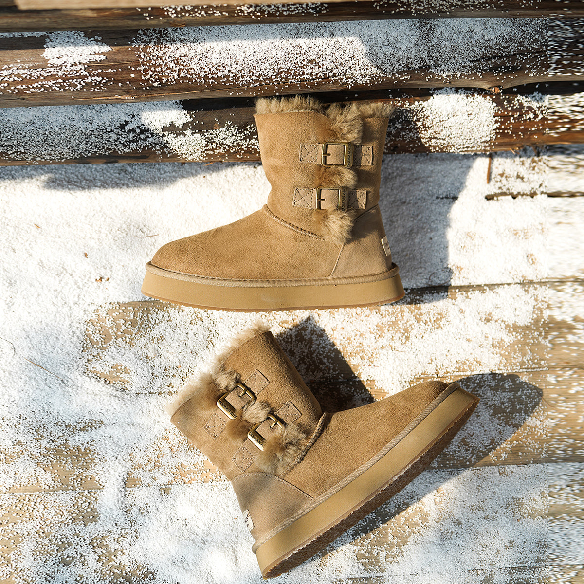 For this winter, look stylish and effortless with the Double-Buckle Knight Snow Boots. This boot offers 2 different looks, a buckled look with two straps or a relaxed, rolled down look. Crafted using Australian Merino sheepskin (combination of fur and leather), they wrap your feet in warmth and maximum comfort. The premium material locks in warmth while removing moisture, thus staying breathable.